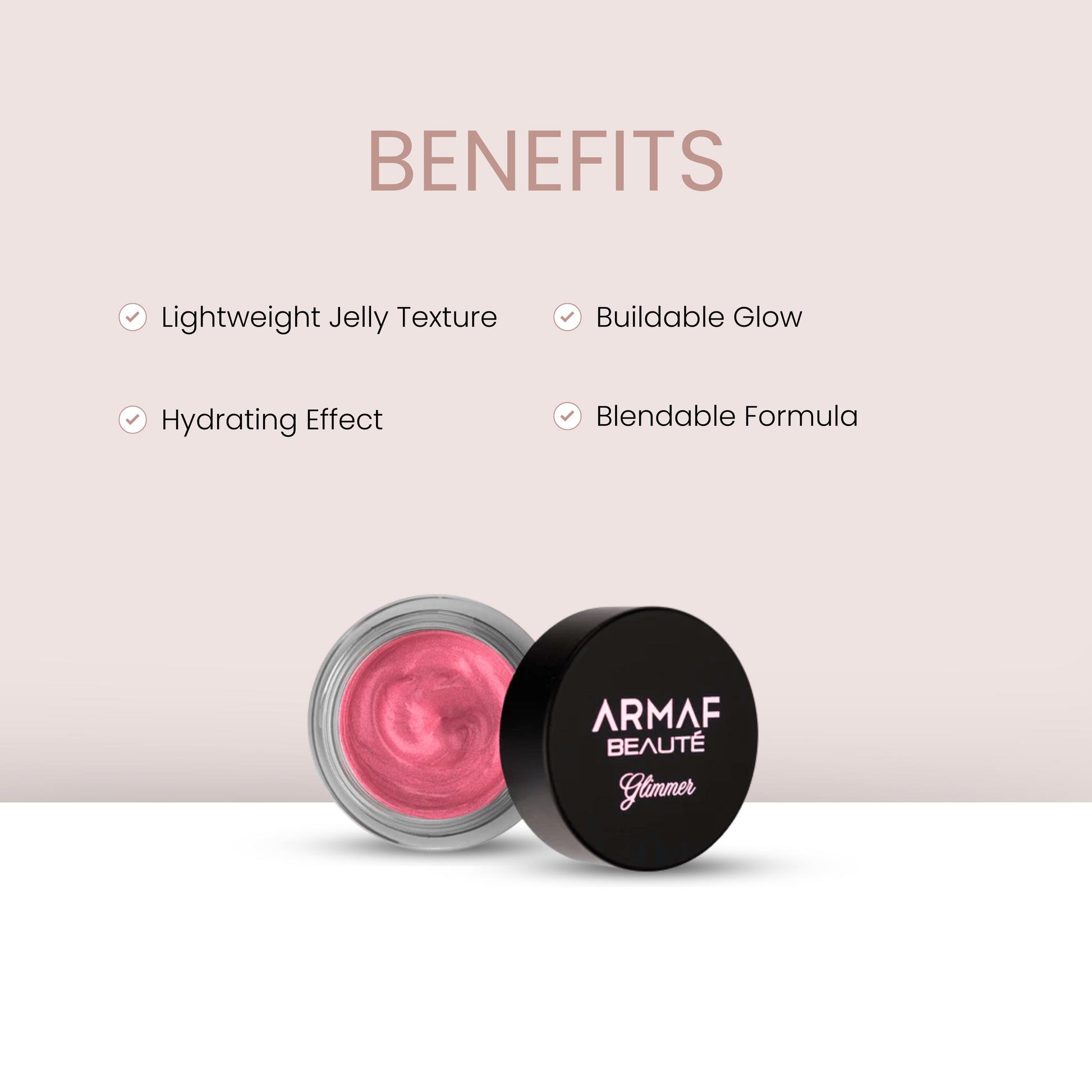 Glimmer: Jelly Highlighter is a smooth, jelly-textured highlighter that blends into the skin for a luminous, glowing skin effect. The versatile jelly formula makes it perfect for multi-use i.e. from highlighter on your face to beautifully glowing eyeshadow on your eyes.